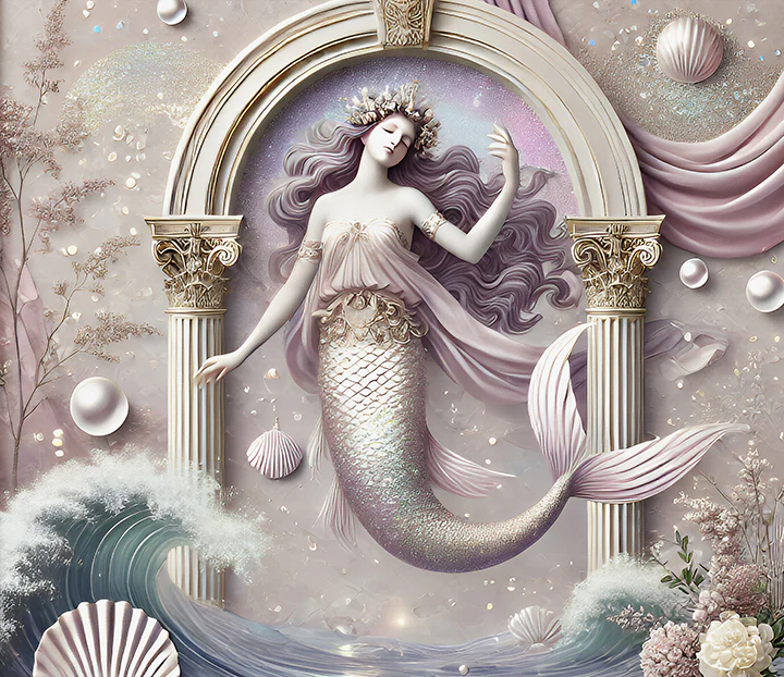 Step into a world of elegance and fantasy with the Ethereal Mermaid Goddess Wall Mural, a breathtaking fusion of classical art and dreamy ocean mythology. This mural features a graceful mermaid goddess framed within ornate arches, surrounded by flowing fabrics, seashells, waves, and soft celestial textures.
