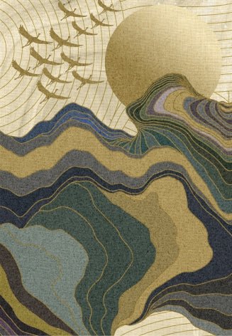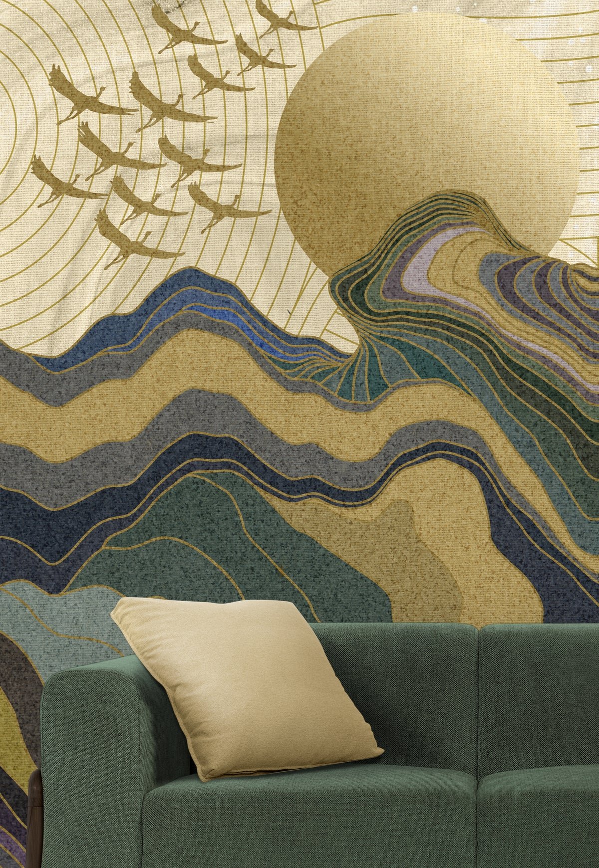 Create a serene and luxurious atmosphere with this Golden Horizon Mountain Wall Mural. An abstract landscape featuring layered mountains, flying birds, and a radiant golden sun.