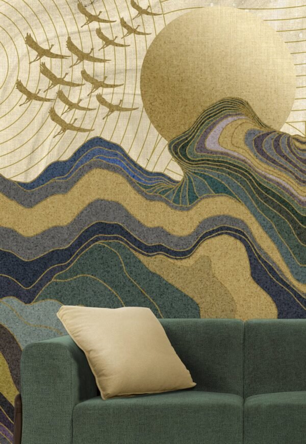 Introduce calm elegance and artistic depth into your interiors with the Golden Horizon Mountain Wall Mural. This abstract landscape artwork blends flowing mountain contours, a warm golden sun, and graceful birds in flight, creating a harmonious and meditative visual experience.